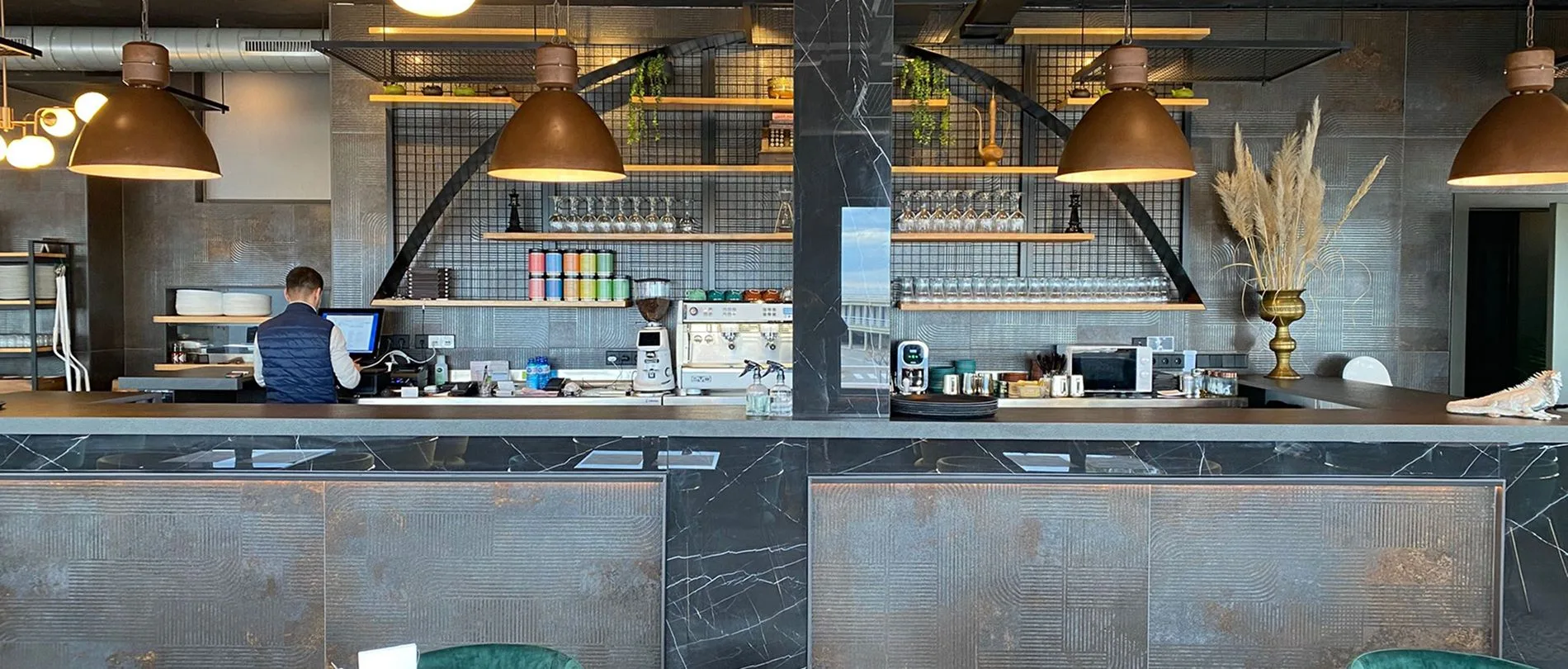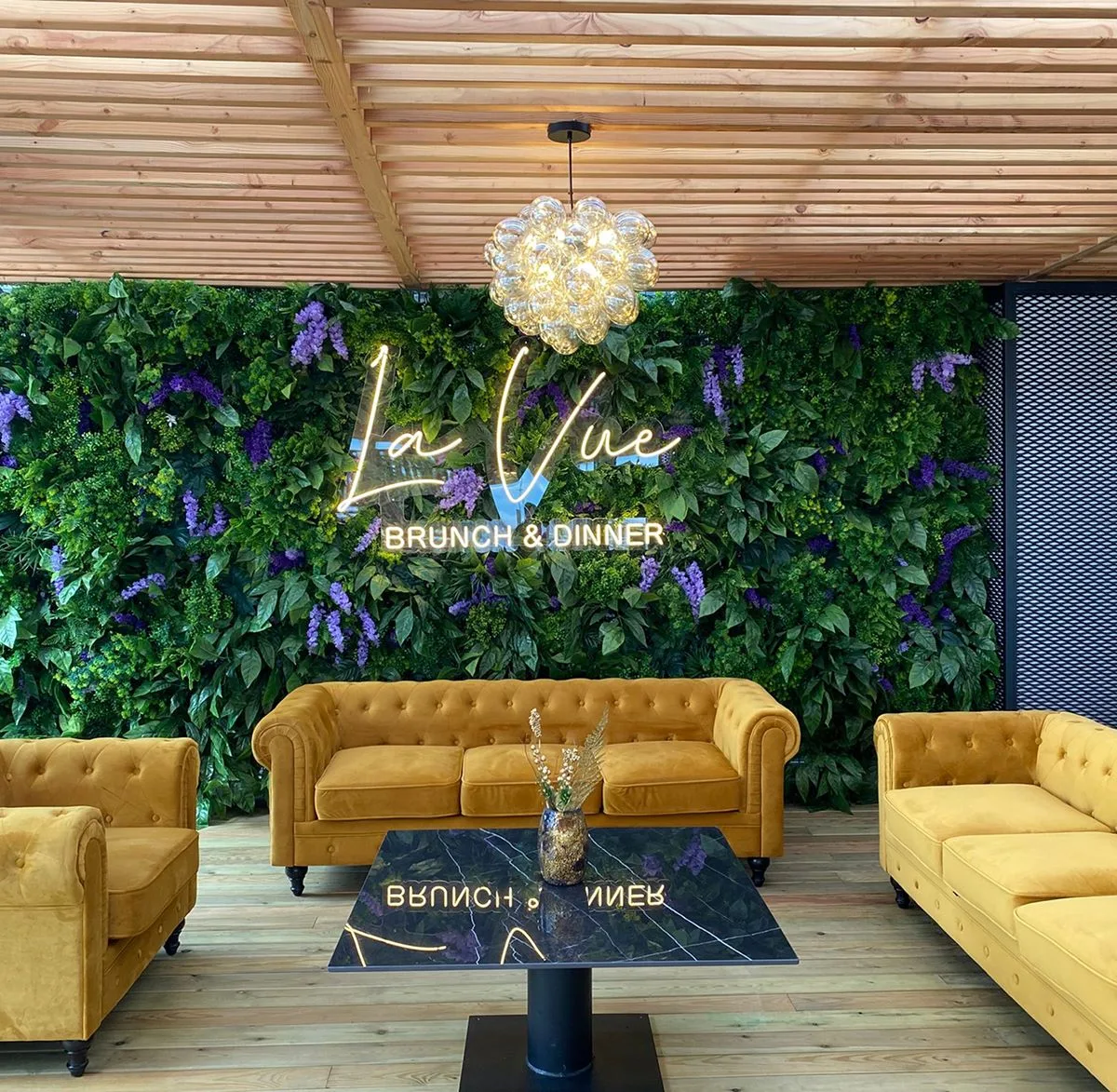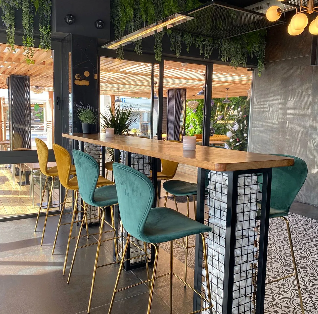 Uno de los puntos focales es el muro vegetal con neón que aporta frescura y vitalidad, convirtiéndose en un rincón perfecto para socializar y generar una experiencia visual memorable. Además, los grandes ventanales abren el espacio hacia el mar, integrando la vista exterior como parte del diseño y llenando el ambiente de luz natural.